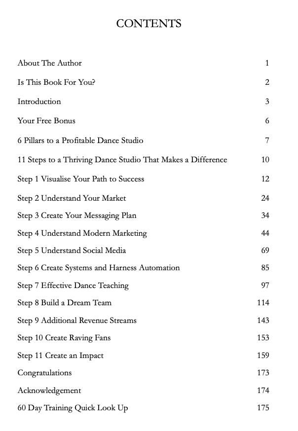 This is a straightforward, step-by-step book that can help transform you into somebody who has the practical skills and business knowledge to build the dance studio of your dreams.No fluff. No hidden secrets. No false promises. Just an easy plan that works.This book is showing you the Roadmap to success and the proven Framework, used by Julia herself and other dance business owners, to build a successful dance studio. A blueprint that can be easily adapted to your own studio.